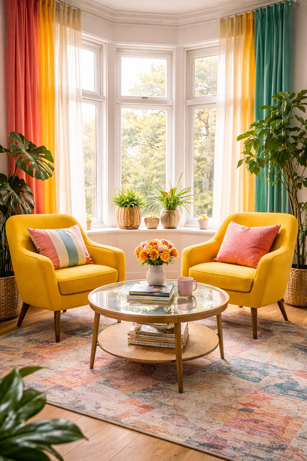 Natural light highlights the vibrant colors. A reading nook in the bay window with yellow armchairs curved in a curving pattern and layers of curtains creates a comfortable but lively atmosphere.